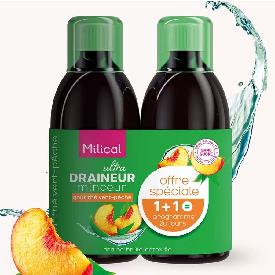 Milical Draineur Ultra green tea peach 500ml x2 (16.91fl oz x2) offers a refreshing and invigorating experience for those seeking to enhance their wellness journey. This exquisite liquid supplement is tailored for individuals eager to support their metabolism and maintain a balanced lifestyle. With its smooth, easily drinkable texture, it effortlessly blends into your daily routine, offering a sensory delight with each sip. The delightful aroma of peach, harmoniously paired with the subtle yet invigorating notes of green tea, creates a rejuvenating experience that awakens the senses. Enriched with the natural goodness of green tea extract, this formula helps to invigorate the body, while its peach infusion adds a touch of sweetness that makes every dose a pleasure to consume. Thanks to the inclusion of chicory root, it further supports your body's natural processes, making it an ideal choice for those who value a holistic approach to well-being. The long-term benefits of this elixir are profound, as it not only aids in maintaining vitality but also ensures a continuous feeling of refreshment. Allow yourself to indulge in the luxurious embrace of Milical Draineur Ultra, where wellness meets elegance in every drop.